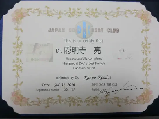 当院の院長は、TBS「世界のスーパードクター」でも紹介されたドックベストセメント療法(Docs Best Cement Therapy)の第一人者・小峰一雄先生 に師事し、現在も知識と技術の研鑽を続けています。